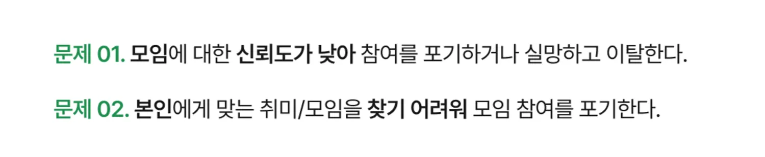위의 두 가지 문제를 해결하는 기능을 제공하면 고객이 니즈를 더 쉽게 충족할 수 있게 되고, 이는 우리 서비스로의 사용자 유입과 모임 참여율을 증가시킬 것이다.