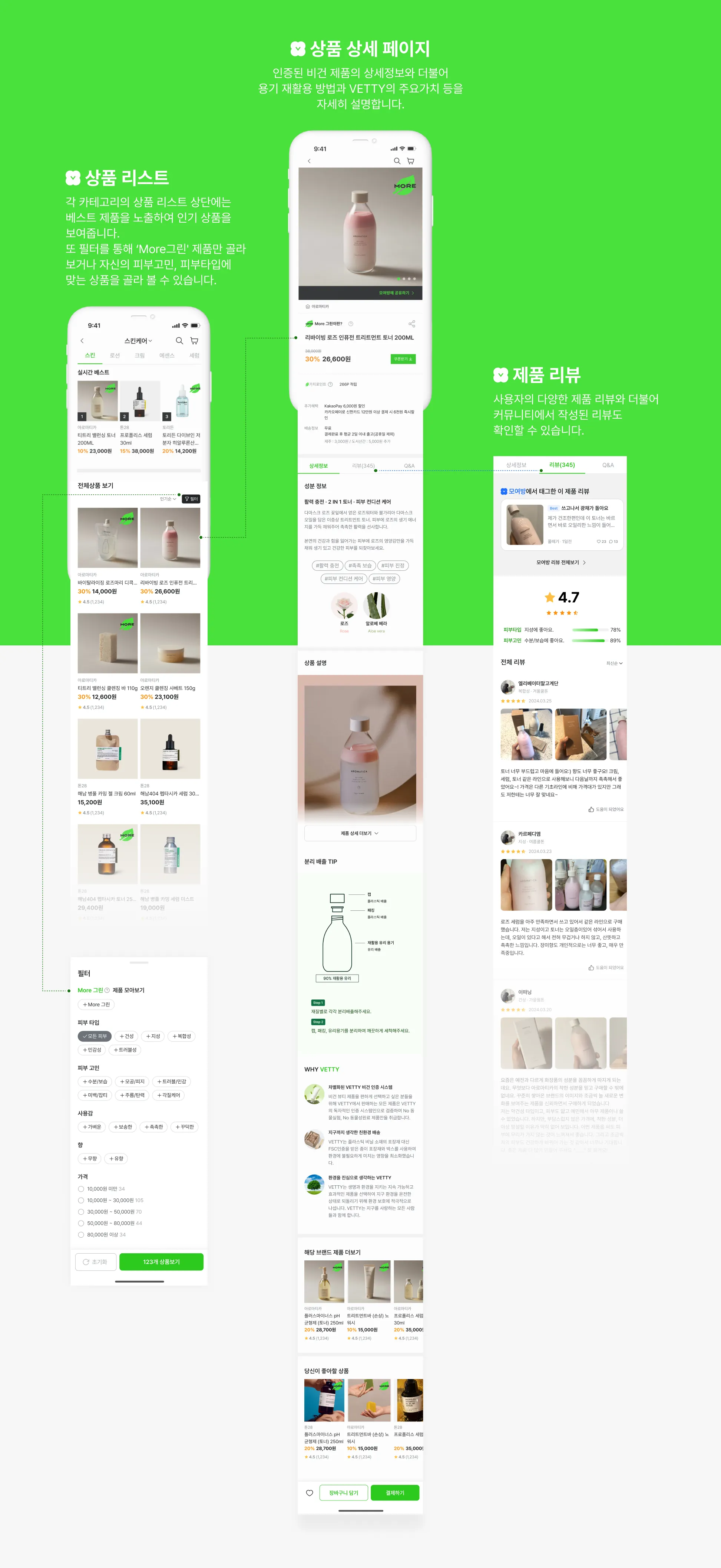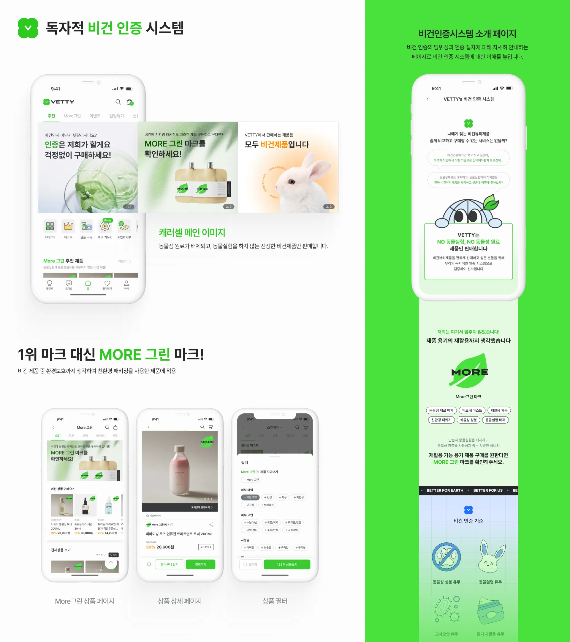 저희 서비스에서는 독자적 인증시스템을 통해 동물성 원료가 배제되고, 동물실험을 하지 않는 진정한 비건제품만 판매하며 ‘More그린’의 경우 비건에 더해 지구환경을 생각한 분리배출이 쉽고, 재활용이 가능한 용기를 사용한 제품에 부여합니다.