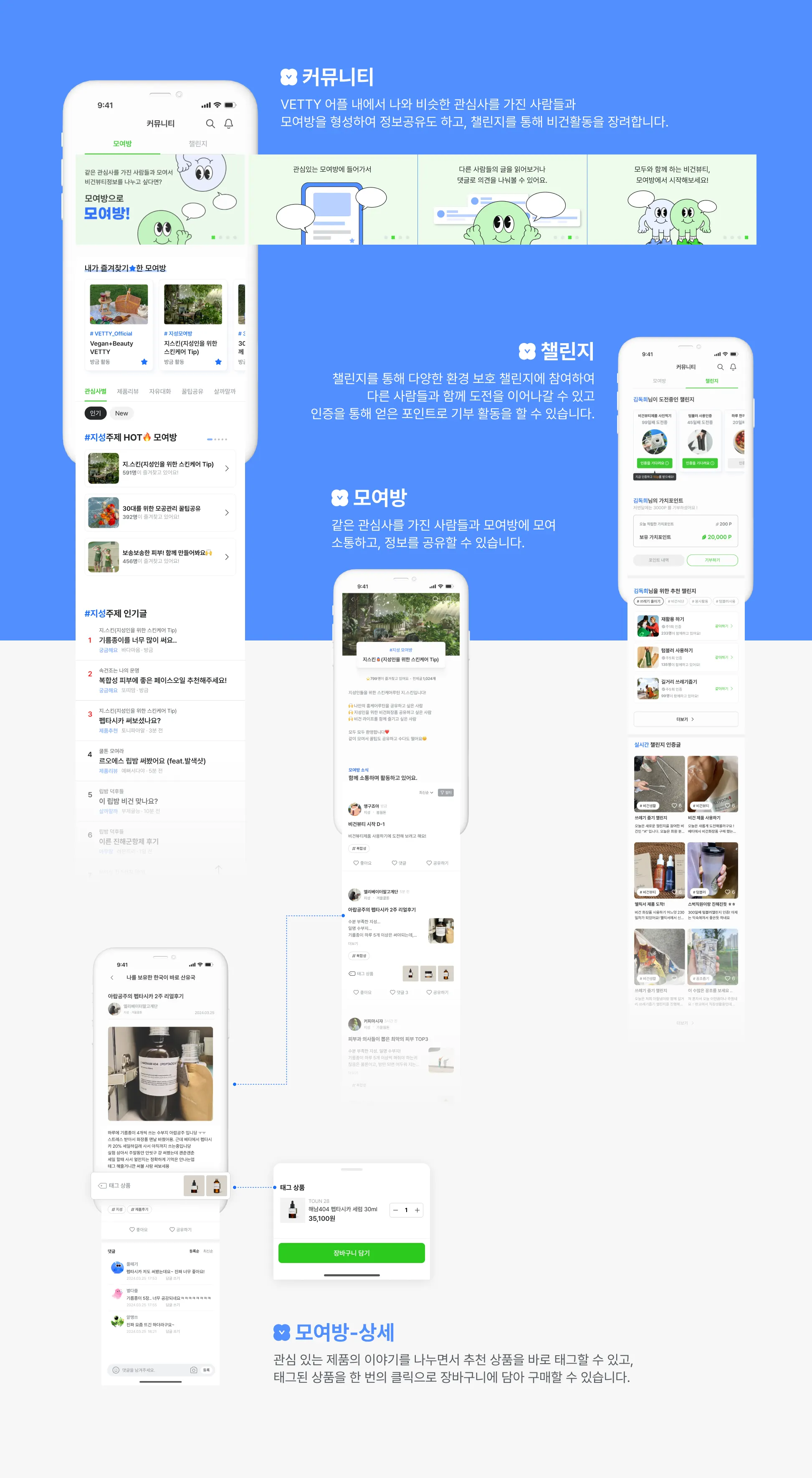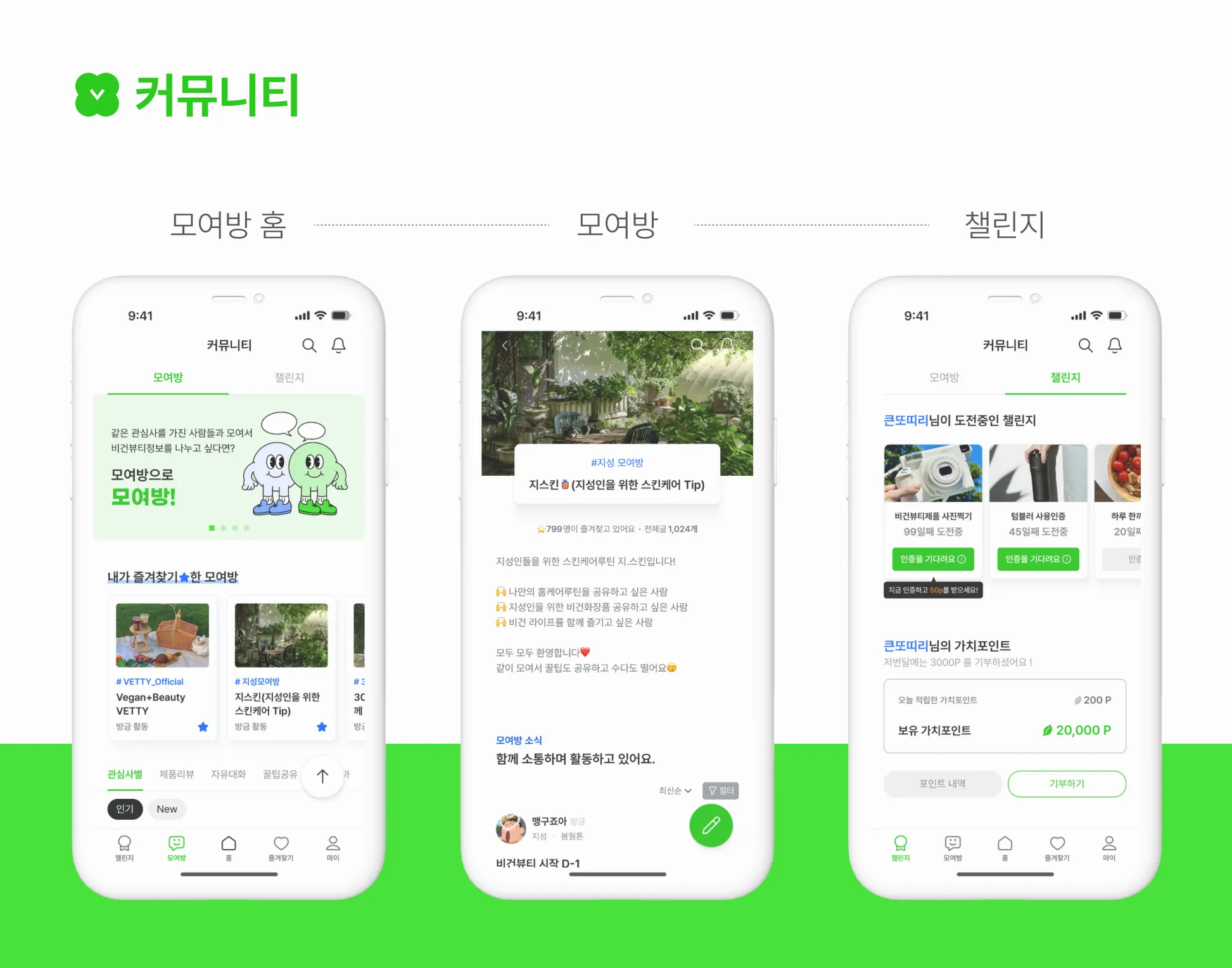 VETTY 커뮤니티 기능 중 ‘모여방’은 비건 뷰티에 관심 있는 사람들이 모여 정보를 공유할 수 있게 하고, 구매 결정에 필요한 정보를 쉽게 얻을 수 있도록 도움을 주는 공간입니다.